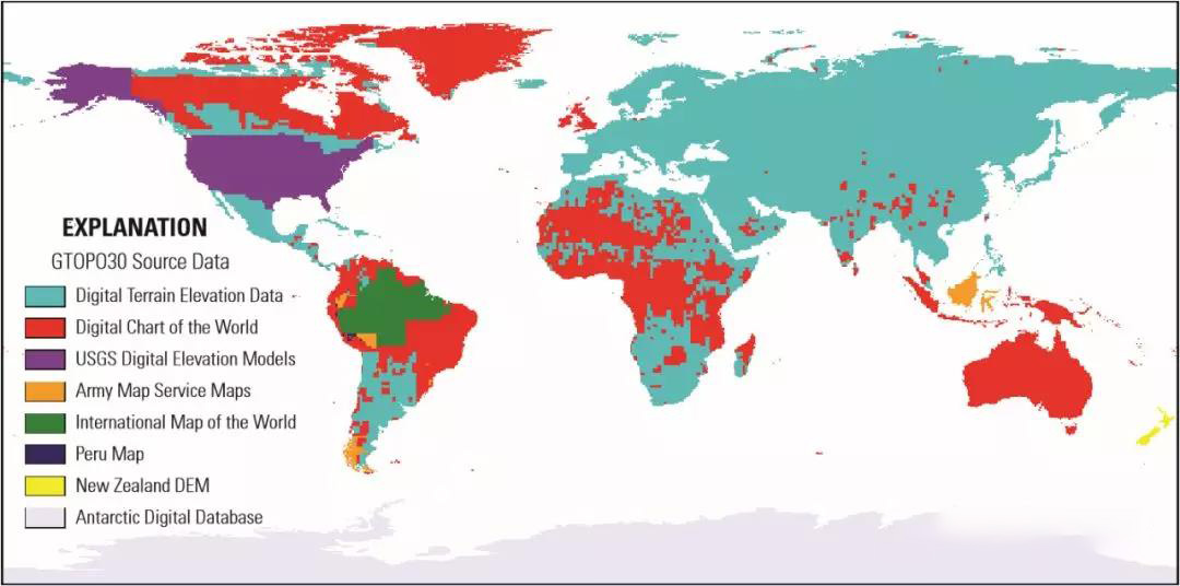 為了滿(mǎn)足EOS和其他全球變化研究項目的需求,20世紀90年代末(1996年完成),美國地質(zhì)調查局(United States Geological Survey,簡(jiǎn)稱(chēng)USGS)開(kāi)發(fā)了全球1Km DEM產(chǎn)品GTOPO30,相當于30弧秒經(jīng)緯度網(wǎng)格分辨率。GTOPO30同樣采用對已有制圖數據重新編制的生產(chǎn)方法,共8個(gè)數據源,由8個(gè)機構參與數據提供、技術(shù)及資金支持,經(jīng)過(guò)三年的合作最終完成。